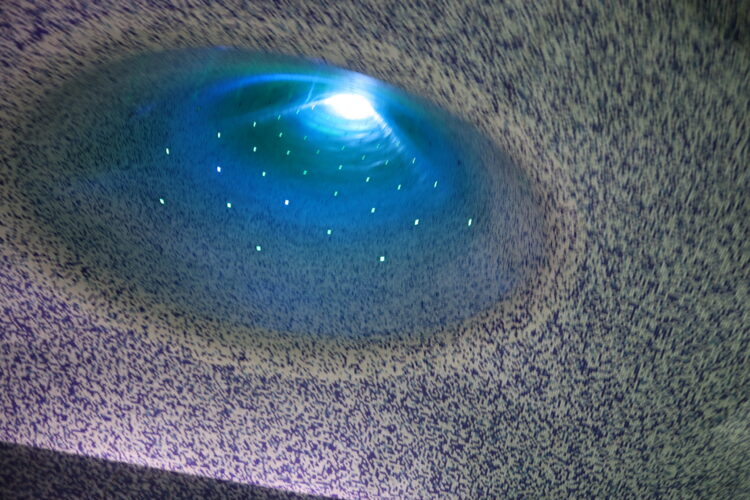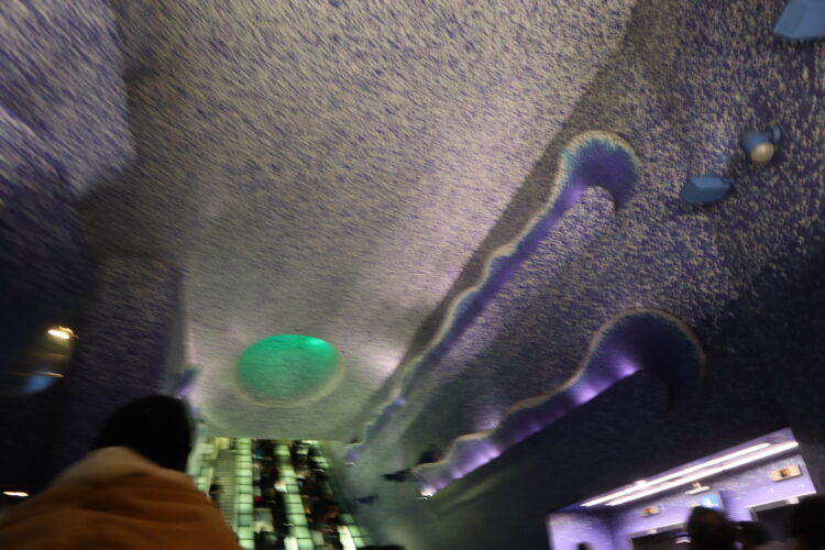 駅構内が青のタイルで敷き詰められていて、地下から地上に上がる途中で天井の部分が夜空のような模様になっていました★