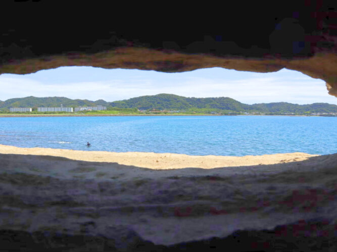 千葉から車で行くことができる小さい小さい島、沖ノ島に行ってきました! 海水浴を楽しんでいる人でとてもにぎわっていました👏とてもいい景色ですよね✨ 島を一周していると、面白そうな洞窟を発見しました!! 洞窟からの景色はとても素晴らしかったです