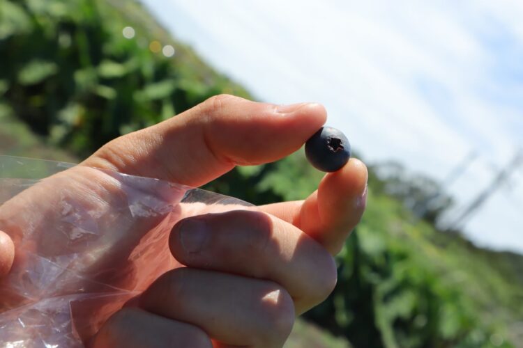 2日目、チェックアウトを済ませた後、キャンプ場の下にあるブルーベリー畑でブルーベリーをつんできました! 受付でブルーベリー狩りを希望している旨を伝えると、袋を渡してもらえます なるべく日に当たっていて、真っ黒になっているものを選びました まるで黒真珠✨